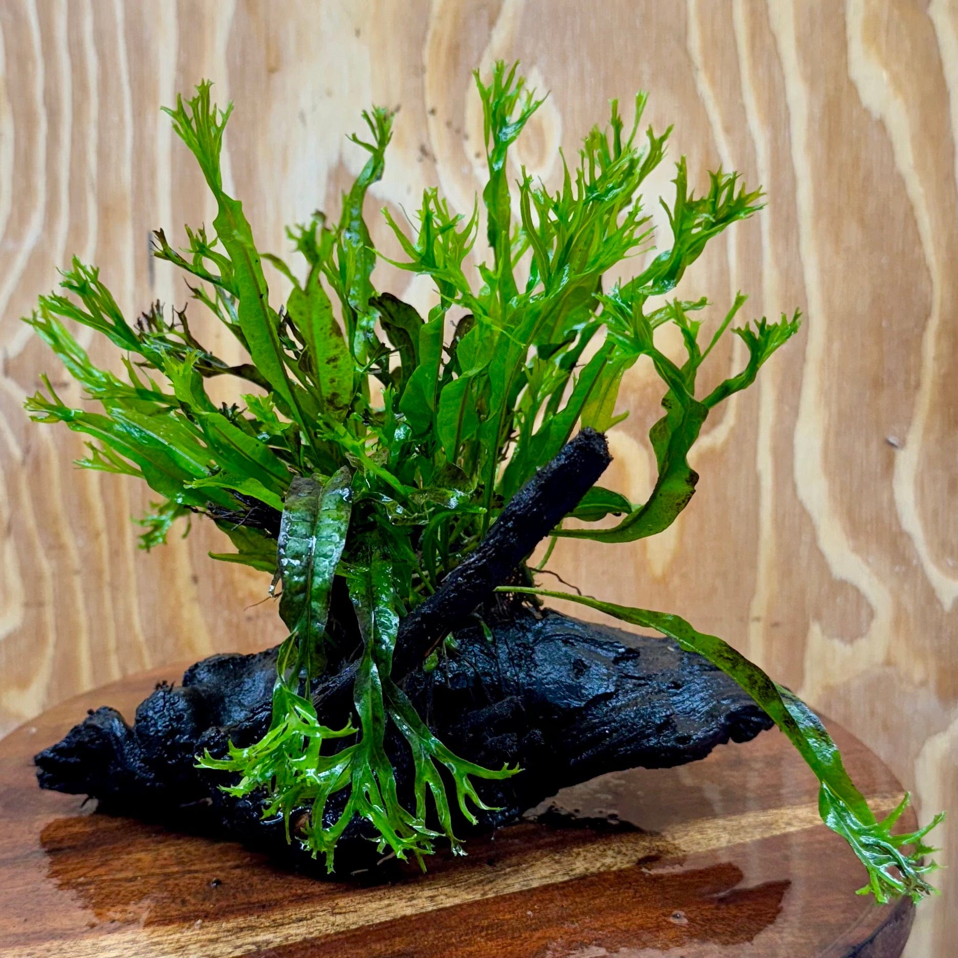 A beautiful mature clump of 'Crested' Java Fern growing on a piece of driftwood.