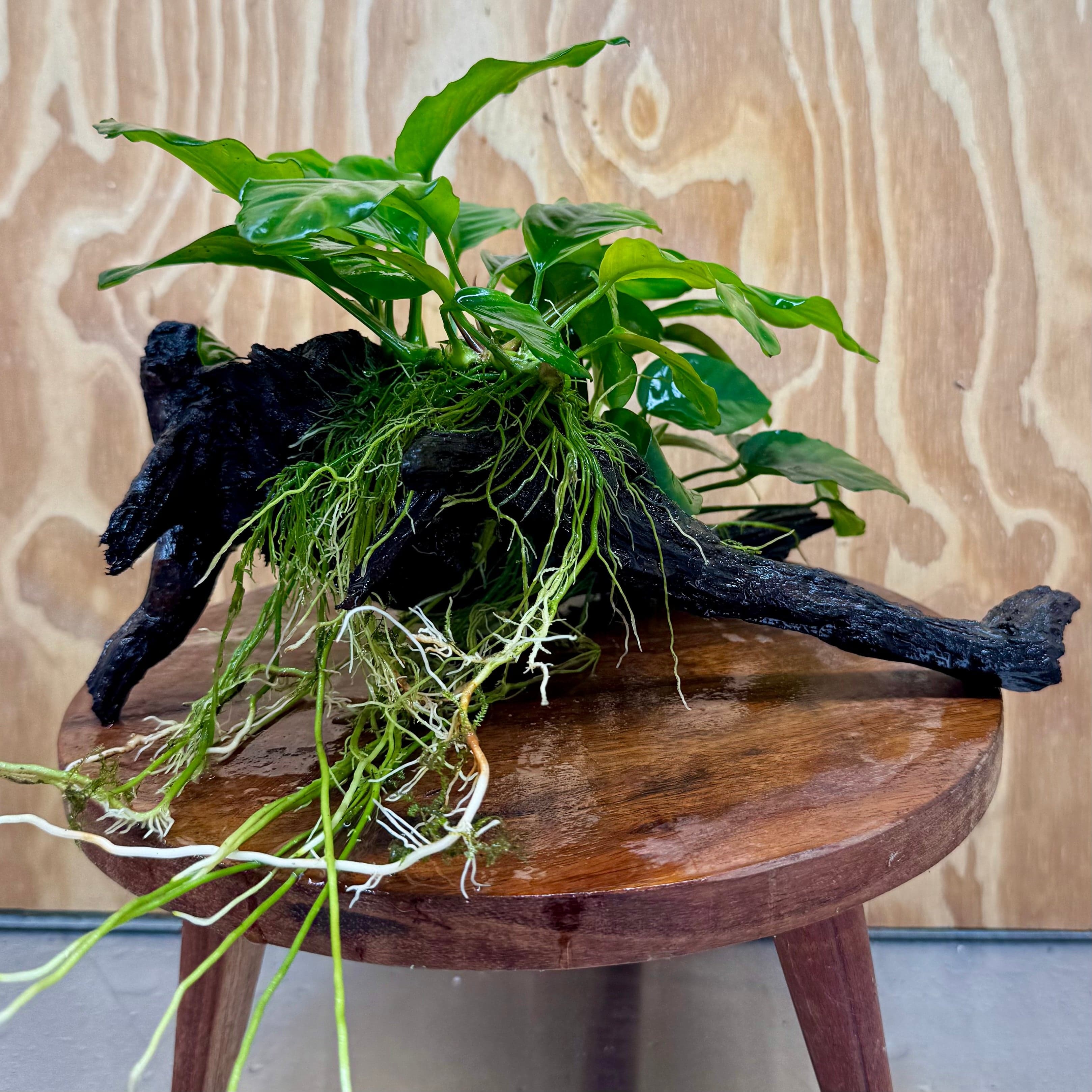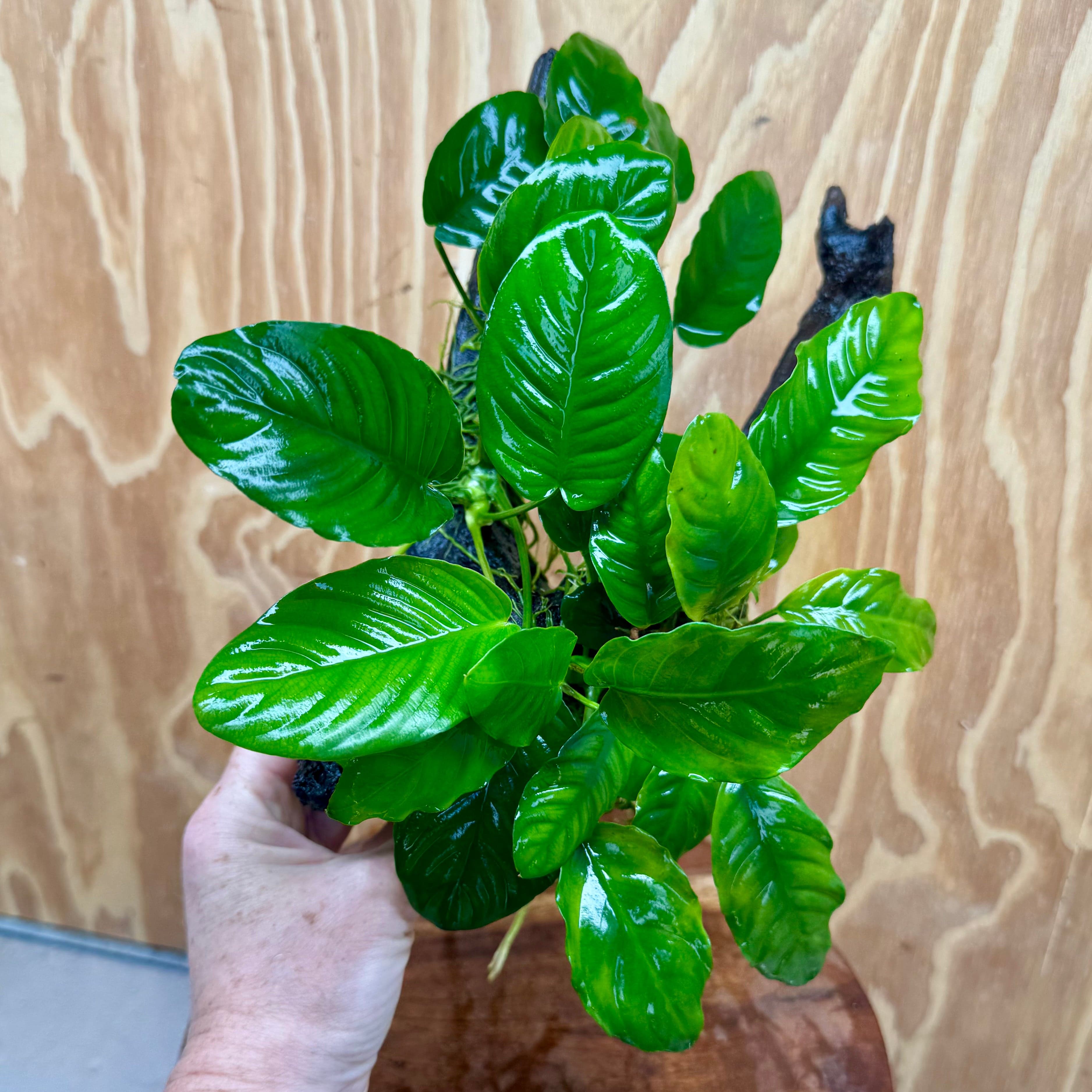 The leaves on an Anubias grow from a creeping rhizome and the roots are primarily used as anchorage instead of a nutrient uptake system. The rhizome should not be buried in the substrate. Anubias are ideal for growing on Driftwood, Rock and Terracotta and are very popular in our Creations Range.